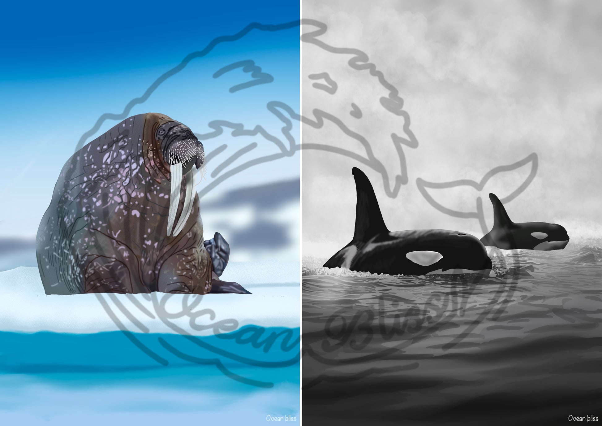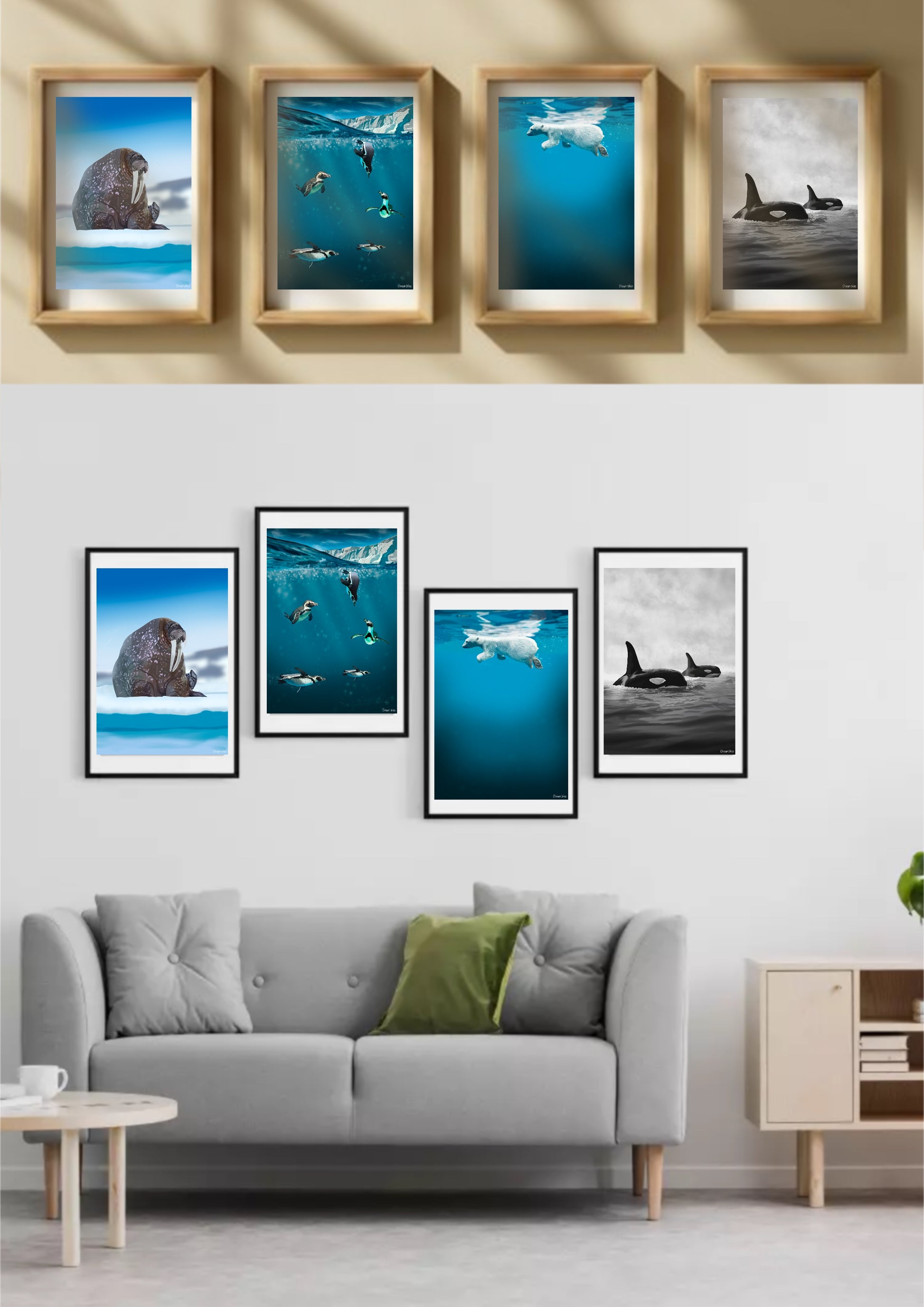 These prints collectively depict striking scenes of marine and Arctic wildlife, showcasing the beauty and diversity of life in cold, aquatic environments. Each image highlights a different species in its natural habitat: